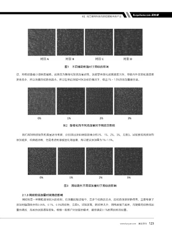 添加树脂固体分的0.05%、0.1%、0.3%网纹粉,见图4。试验发现,网纹粉太少,网格连接不起来,而随着网纹粉添加